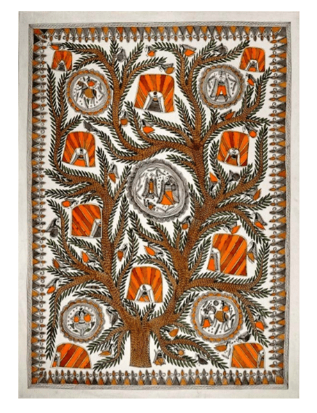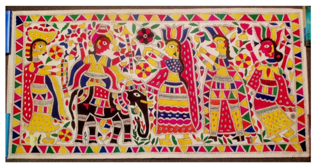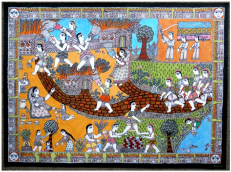 Madhubani art has evolved in different ways among the different castes present in Bihar. The Karna Kayasthas have evolved the Kachni style; the Bharni sub-genre has been developed by the Mahapatra Brahmins who are predominantly scribes. However, I want to focus on the works of tribal women and the lower castes who have overcome large barriers to earn recognition around the world. The Gobar style was developed by Jamuna Devi, which involves using a subtle brown cow dung wash to prepare the paper of the painting. These paintings have been exhibited in New Delhi, Japan, and other places around the world. The recurrent themes include episodes from an oral epic that features the mythical hero Raja Salhesh and his powerful adversaries. According to Narayan Sinha, by focusing on themes that are not drawn from the Ramayana and Ram (mostly present in upper-caste painter’s works) the Dusadh people want to quietly confront the worldview of the upper castes and develop their ideas independently.