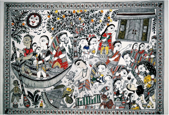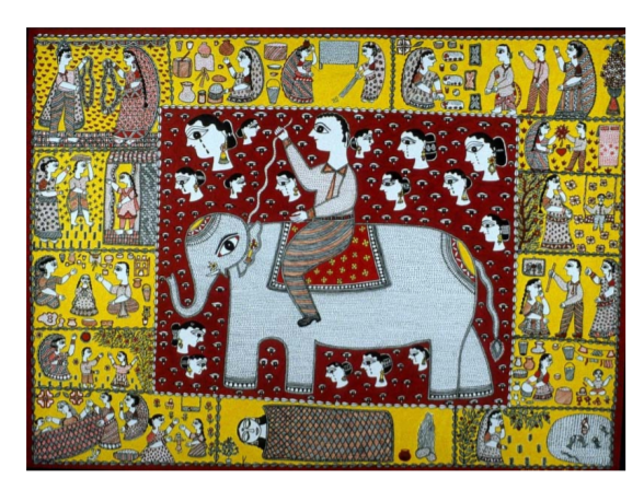 Patriarchy is deeply rooted in Mithila. The men take the most important decisions and restrict the imagination of women. However, a critical attitude has emerged in society, and it is reflected in some of the paintings. A great example is Sugata Kumari’s Beast of Burden. The principal image is that of a man riding an elephant. All around him has been drawn the life-cycle of the Mithila woman and the struggles that she has to face.