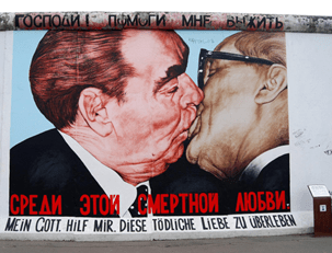 The Berlin Wall has many beautiful murals and paintings but this one stands out from the rest. It ironically captures the moment Leonid Brezhnev and Erich Honecker had signed an important arm deal through which Germany would continue providing support to the Soviet Union. Vrubel remarked in an interview with Andrey Borzenko on 11 November 2014 “But I wanted to paint specifically on the Berlin Wall and specifically Brezhnev and Honecker’s kiss. In this painting, there’s one German and one Russian, and the Berlin Wall is about the same thing but in reverse: here [in the painting], there’s total love, while the Berlin Wall separates two worlds — it was a perfect fit”.